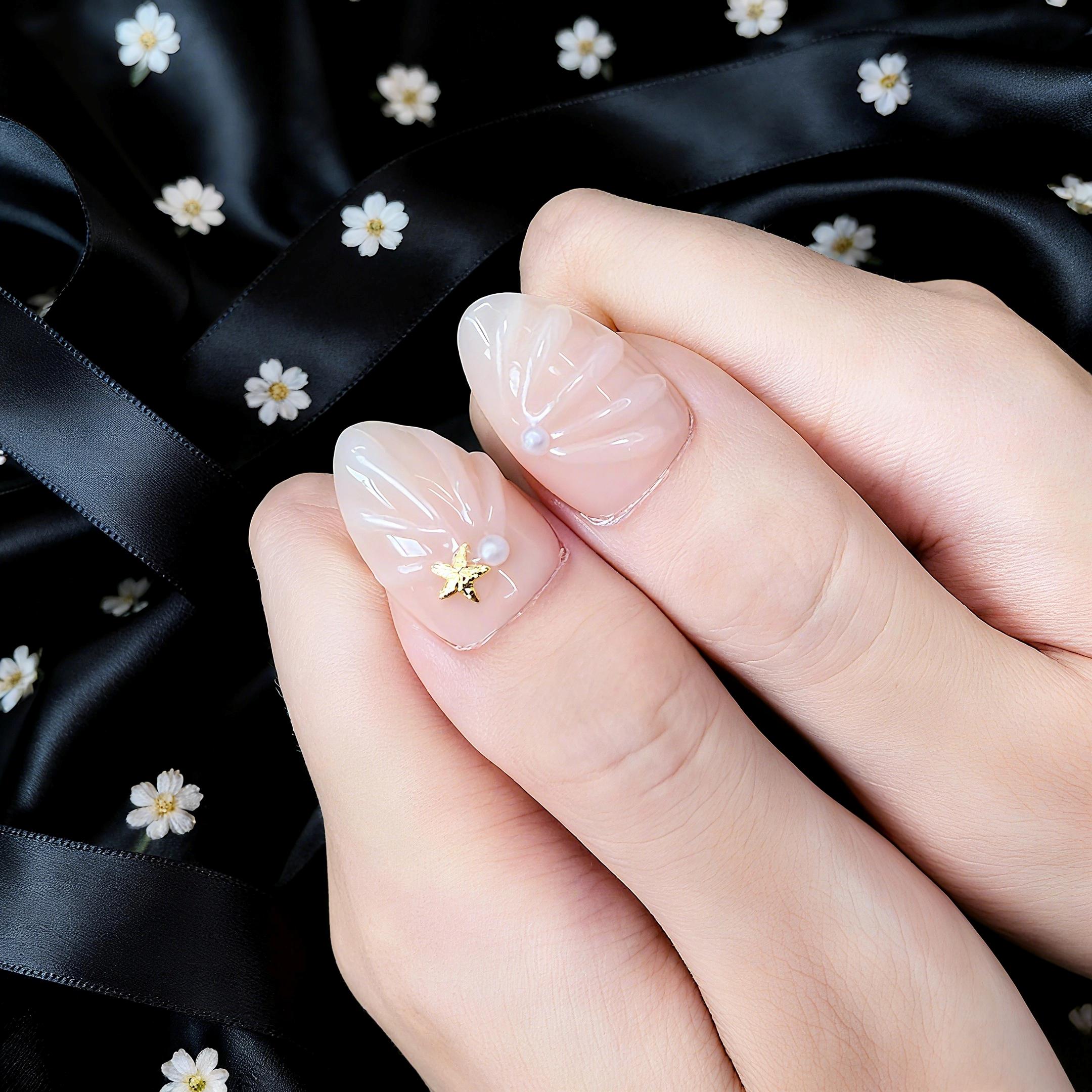 ✨ Where coastal breeze meets blooming florals. Blossom Shore is a 10-piece handmade press-on nail set that fuses nude-beige tones with delicate 3D blossoms, pearl drops, and seashell-inspired textures. Accents...