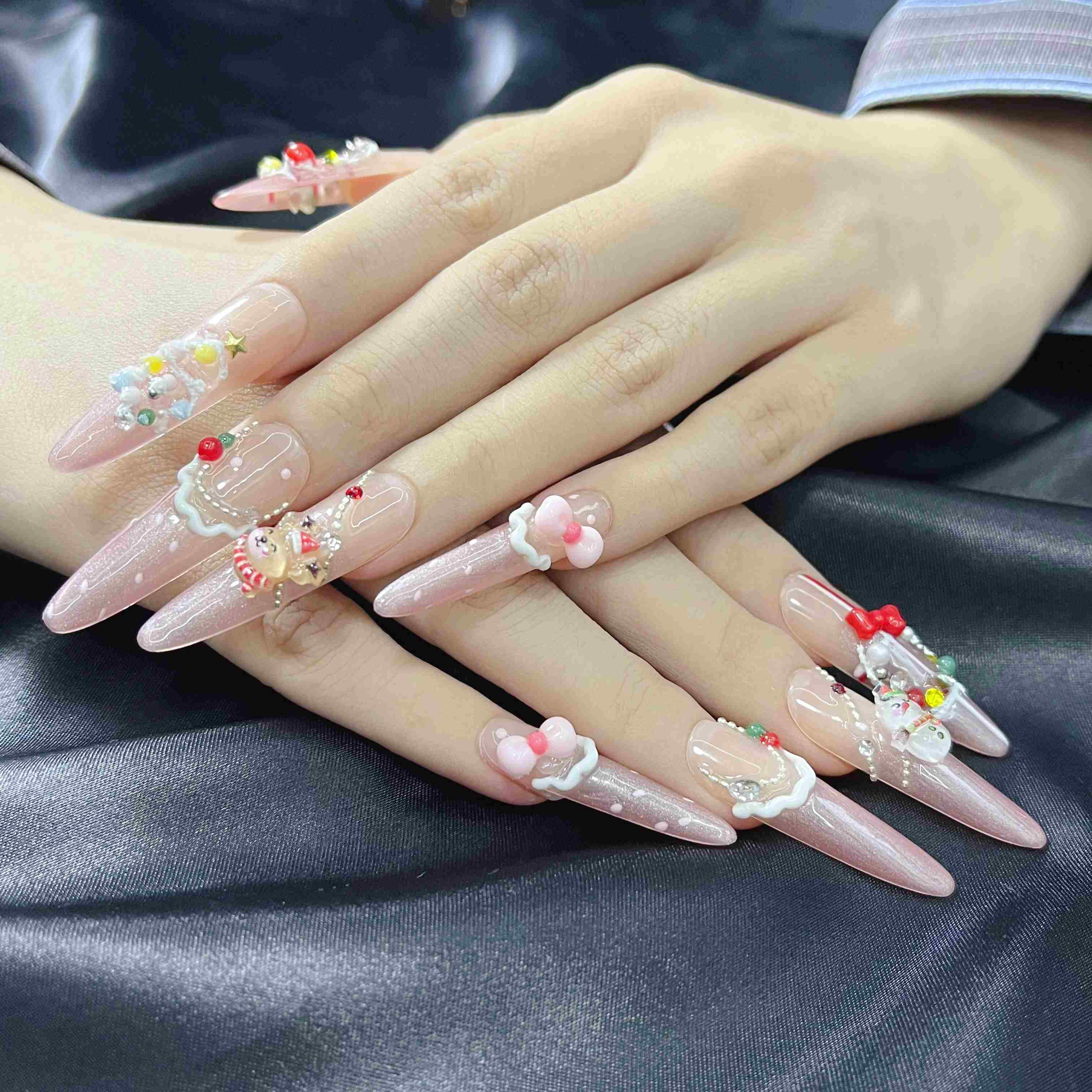🎀 Sweet sparkle, handmade for the holidays. Frosted Merry is a 10-piece handmade press-on nail set inspired by the joy of Christmas treats and winter lights. A soft blush-pink base...