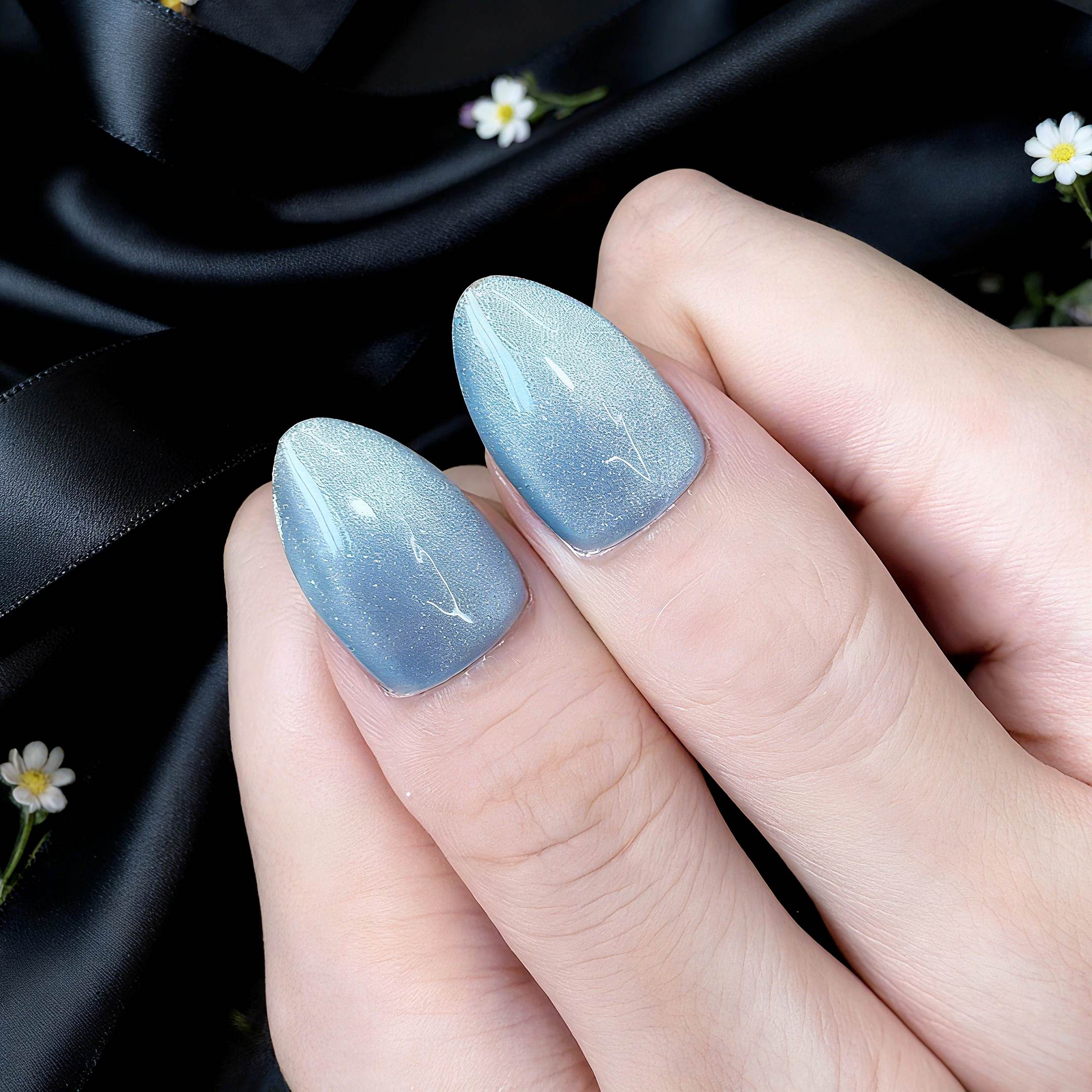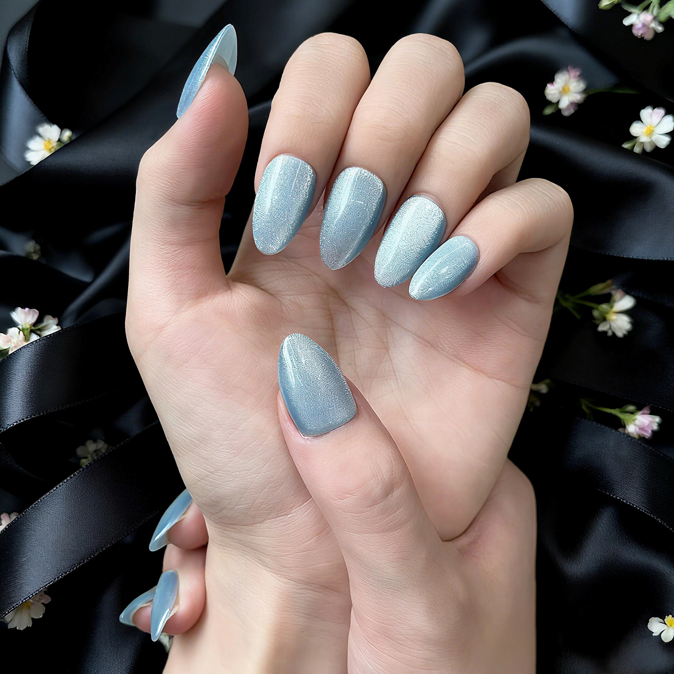 🌙 Moonlit Tide — subtle elegance, kissed by the sea and lit by moonlight. This 10-piece handmade press-on nail set features a soft grey-blue base infused with delicate pearlescent shimmer....