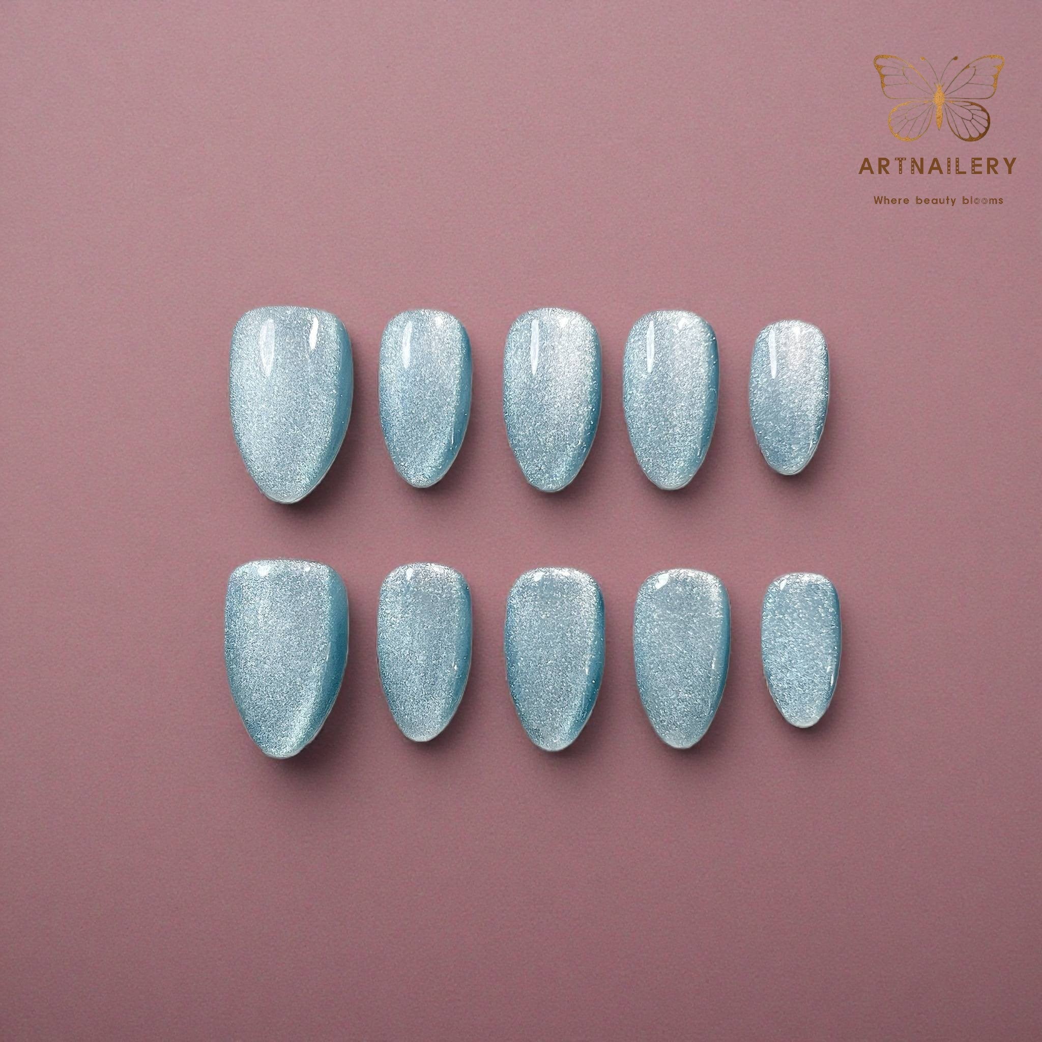 🌙 Moonlit Tide — subtle elegance, kissed by the sea and lit by moonlight. This 10-piece handmade press-on nail set features a soft grey-blue base infused with delicate pearlescent shimmer....