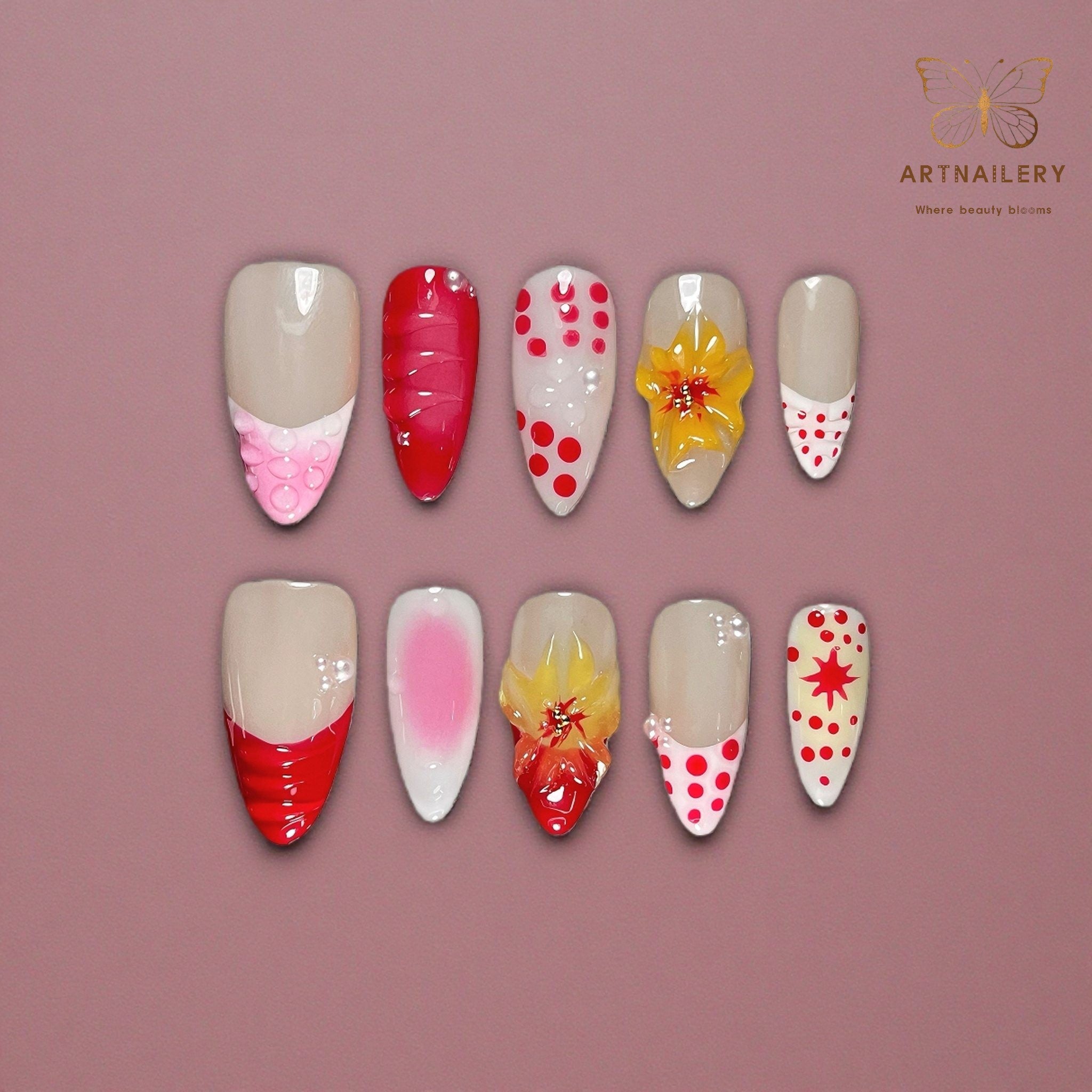 ✨ Artistry Collection — statement designs with a crafted soul. Pearl Sonata is a 10-piece handmade press-on nail set that harmonizes elegance with playful detail.Featuring blush pink gradients, cherry-red polka...